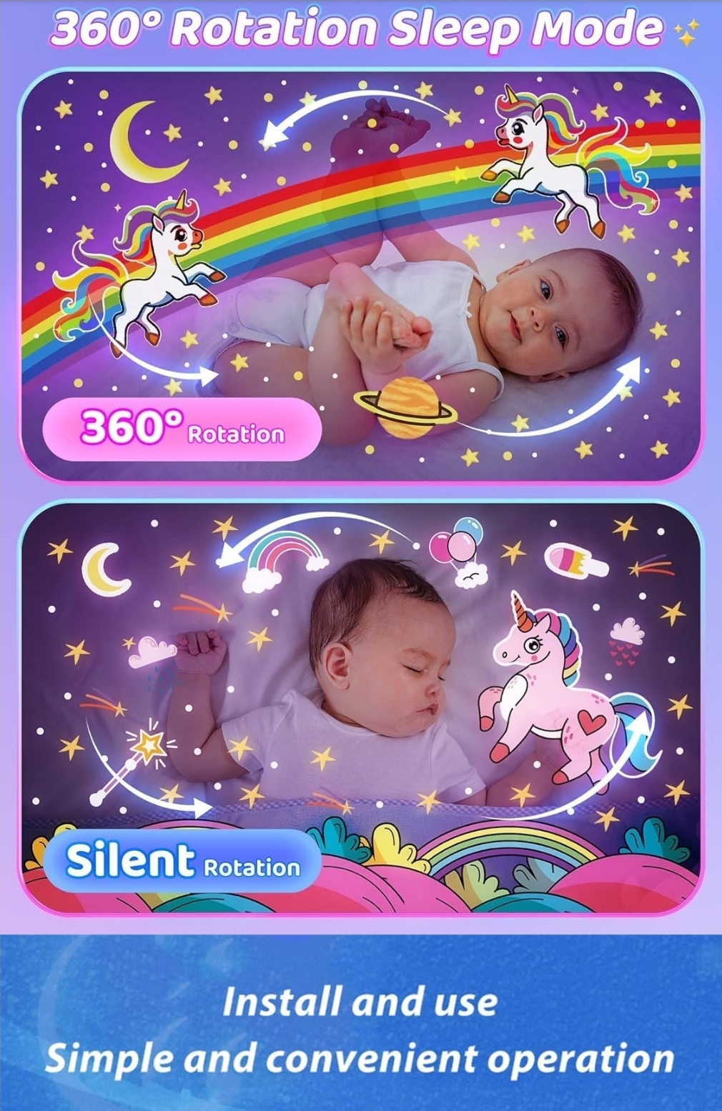• دوران 360° ساحر: يمكنك الاختيار بين الوضع الثابت أو الدوران البانورامي الذي يملأ الغرفة بالحركة والألوان.